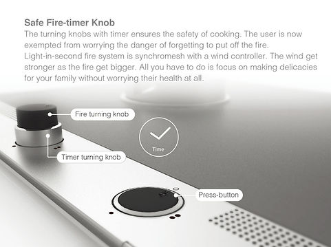 爐面下附有火力燈光顯示,不僅引導使用者不用彎下腰來觀看火力,更兼具美觀;為了避免煮飯時吸入過多的油煙,氣流引導系統讓油煙飄向抽油煙機;以及有別於傳統式轉扭,結合計時器,能防止長時間烹煮使用或是忘記關火的危險。